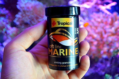 Osobiście podchodzimy dość sceptycznie do granulatu, ze względu na różne doświadczenia i to, że nie wszystkie ryby przepadają za tego rodzaju pokarmem. Po otwarciu wieczka znajduje się zabezpieczająca, przeźroczysta folia. Zdzieramy ją i rozpoczynamy karmienie. Po wrzuceniu do zbiornika pokarm rzeczywiście dość szybko zaczyna opadać, choć niektóre granulki unoszą się przez pewien czas na powierzchni. Co najważniejsze zainteresowane są nim ryby, które ochoczo rozpoczynają jego pałaszowanie. I tutaj też pojawia się mega zaskoczenie. Pterapogon kaudernii, który zupełnie nie chce jeść u nas pokarmów suchych postanowił również skusić się, choć co prawda tylko na jedną granulkę. Bardzo istotne jest również to, jaki pewnego rodzaju ruch rozpoczął się po wsypaniu pokarmu. Otóż z zakamarków wyszły krewetki, kraby pustelniki, a także inne drobne życie, które także chciało skosztować tego produktu. Kilka ziarenek wpadło również w "mordki koralowców", które również wyglądały na zadowolone. Według producenta karmić można kilkakrotnie w ciągu dnia małymi porcjami, a przed użyciem warto delikatnie wstrząsnąć opakowaniem, co ma za zadanie zapobiegać naturalnemu procesowi zbrylania.