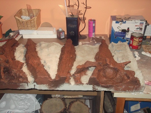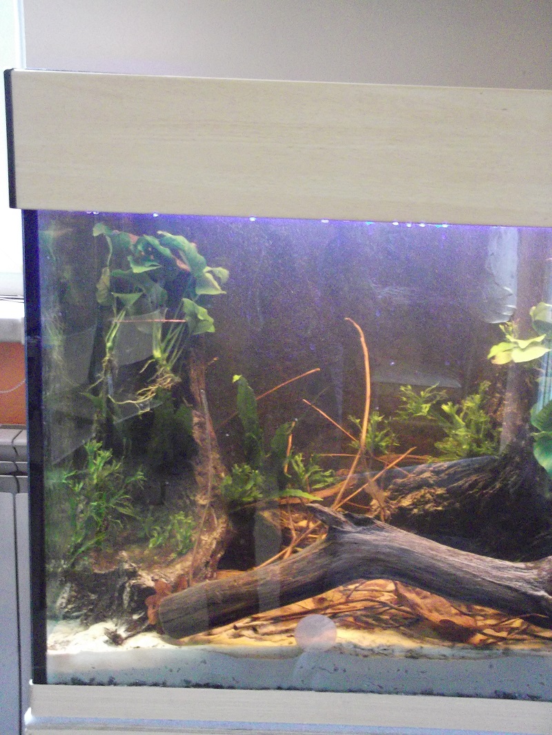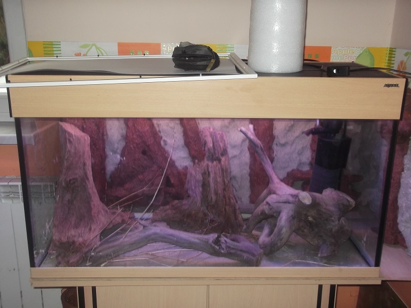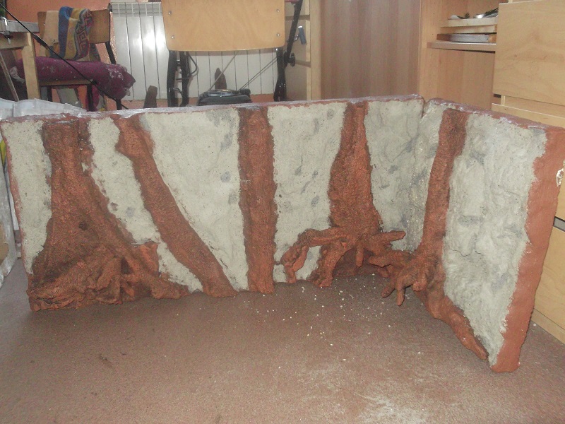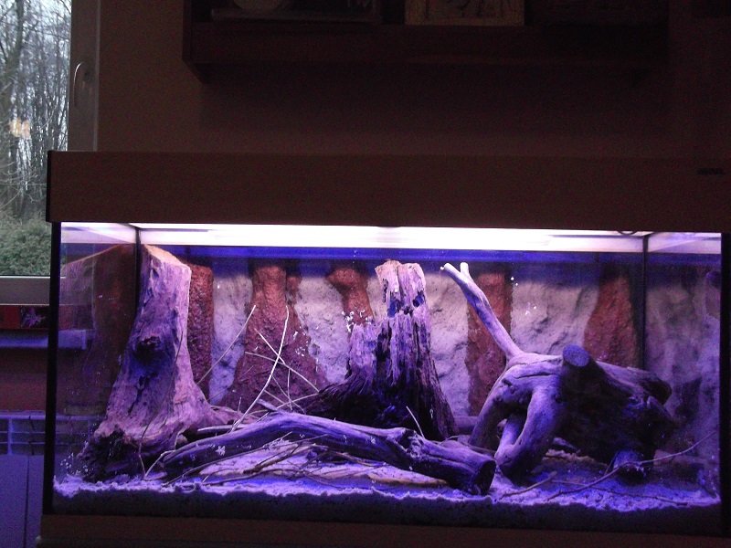 Tło to mój pomysł i wykonanie. Jest to tło zewnętrzne znajduje się z tyłu i z boku akwarium. Wykonane jest ze styropianu. Korzenie wycinane nożykiem, całość faktura wypalana opalarką, na to zaprawa klejowa. Korzenie zostały pomalowane w odcieniach brązy, a przestrzeń między nimi oklejona piaskiem. Niestety na sucho ładnie wyglądało w oświetleniu, a po zalaniu tła nie widać i trzeba będzie je doświetlić.