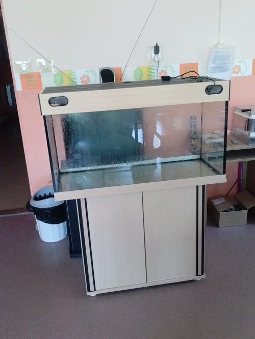 Przy aranżacji i pracy nad akwarium, pomagali koledzy z fundacji. Razem myliśmy akwarium, osprzęt i korzenie, czy płukaliśmy żwir. Robią zemną podmiany wody, czy czasem nakarmią rybki.
